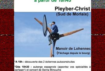 Pratique. Fête de l'éolien, vendredi 6 juin 2014, à partir de 18h45 : présentation des éoliennes, et levée des verres à leur longue vie, pique-nique partagé avant à 21h un spectacle "la machine à remonter le vent" de Thomas Plassard du cirque Venturi. Ouvert à tous. Lieu dit : Manoir de Lohennec à Pleyber-Christ, suivre le fléchage depuis les feux, au bourg. Sur le web, www.alterrebreizh.org
