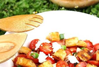 Dans un saladier, mélangez les tomates avec les oignons rouges et la mozzarella. Ajoutez les croûtons encore tièdes et décorez de quelques feuilles de basilic ciselées. Terminez par un peu de fleur de sel, un tour de moulin à poivre, un peu d’huile d’olive et de vinaigre balsamique.