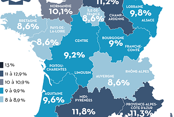 Les disparités régionales du chômage varient peu avec ce nouveau découpage des régions. Le taux de chômage est toujours plus fort tout au nord et au sud qu’ailleurs. La plupart des régions ayant fusionné avaient des taux de chômage comparables, à une exception près : le Midi-Pyrénées (10%) n’a pas gagné au change en s’associant au Languedoc-Roussillon (13,9%) qui, à l’inverse, profite de l’aubaine pour laisser la peu enviable première place au Nord-Pas-de-Calais (13%).