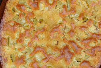 - Beurrer un moule à gratin puis y verser la pâte. Déposer les morceaux de rhubarbe sur la pâte. Enfourner à 180°C pendant 25 minutes.