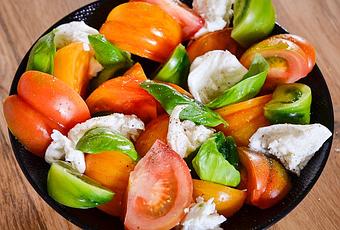 Je me baladais dans la Grande Epicerie dans le 7ème arrondissement de Paris et leur rayon Fruits et Légumes est une sorte de temple de produits originaux, certes plutôt chers, mais tout de même un vrai régal pour les yeux. Alors j’ai craqué pour des petites tomates vertes et des tomates ananas: une sorte de coeur de boeuf orange. Vous trouverez certainement chez votre primeur différentes variétés de tomates qui vous inspireront en fonction de votre humeur du moment, green zebra pour surprendre vos invités, des jaunes lemon boy, des noires de Crimée, des tomates ananas entre le orange et le jaune, des allongées, des coeurs de boeuf… Le tout est de mettre la main sur plein de tomates différentes et de les mixer dans une salade colorée, pour changer de l’éternelle « Tomate-Mozza ». C’est ce que j’ai fait pour cette jolie salade, en plus d’une bonne mozza juste déchirée à la main pour le côté « salade en 2 minutes chrono », des feuilles de basilic cueillies de mon pied de basilic frais et une bonne huile d’olive.
