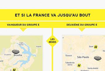 La Coupe du Monde au Brésil débute dans un peu plus d’une semaine et aussi bien l’Angleterre que la France ont toutes leurs chances d’aller très loin dans la compétition. Les Bleus de Didier Deschamps peuvent même créer la surprise alors qu’outre-Manche, le pessimisme est de mise pour les Three Lions. Comme il est toujours intéressant de savoir quel sera le parcours d’un adversaire potentiel, nous vous laissons découvrir le parcours de nos chers amis les Français pendant cette Coupe du Monde, grâce à l’infographie réalisée par Hertz, qui récapitule le calendrier de la compétition mondiale jusqu’à la finale.