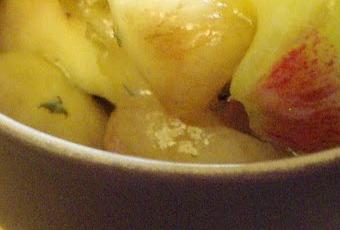 Salade de pêches de vigne: 3 pêches de vigne par personne 1 peu d'huile d'olive 1 pincée de sel du gingembre confit du romarin (1 branche pour 6 pêches)