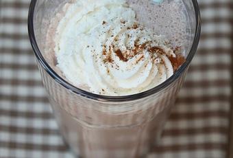 Ingrédients pour 1 personne : 150ml de lait frais entier, 2 c. à soupe de chocolat noir en poudre, 1 c. à café de sirop d'agave, 1 pincée de cannelle moulue, 4 glaçons, 50ml de crème liquide entière.