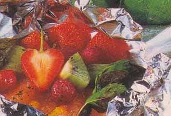 Répartir équitablement les fruits sur chaque moitié de feuilles d’aluminium. Ajouter 2 têtes de menthe par papillote. Saupoudrer légèrement de sucre. refermer hermétiquement en pinçant les bords.