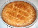 Abaissez le reste de pâte au diamètre du moule puis recouvrir le dessus.(bien faire adhérer les bords en pinçant tout le tour).Battre l'oeuf , dorer le dessus du gâteau au pinceau puis tremper une fourchette dans l'oeuf et faire des stries sur le dessus du gâteau dans un sens puis dans l'autre (en croisant).