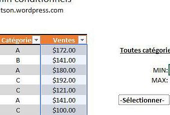 Dans l’exemple ci-bas, nous souhaitons trouver le Min et le Max mais pour une plage de données restreinte par la catégorie des ventes. Ainsi, nous avons élaboré un petit menu déroulant pour identifier la catégorie désirée.