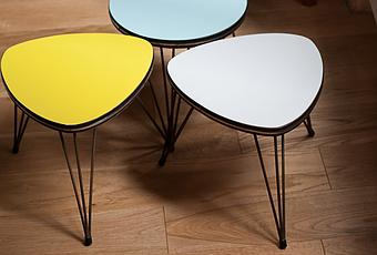 J’ai chiné il y a quelque temps trois mignonnes petites tables basses porte-plantes tripodes, qui avaient besoin d’un sacré coup de jeune. Le formica marron d’origine était décoloré, et déjà à la base, pas très beau !