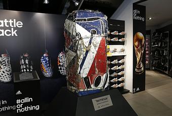 Deux semaines plus tard, l’amas de tôle froissée a donné naissance à une œuvre d’art nommée « Terminus ». Terminus est exposée depuis le 11 juin au magasin adidas des Champs-Elysées et le sera durant la Coupe du Monde de foot avant d’être vendue aux enchères au profit de Diambars, association qui œuvre pour l’éducation par le sport.