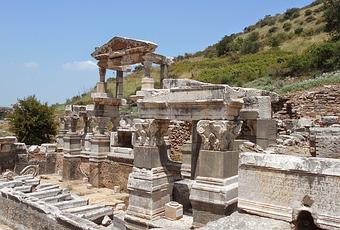 Inscription au-dessus de la triple porte dite de Mazaeus et Mithridates, honorant les gens d'Éphèse, ainsi que Marc-Agrippa, Julia, César et Auguste. En voyant l'inscription, je me suis demandé s'il s'agissait bien du Mithridates qui a maintes fois défié et combattu l'empire romain jusqu'à sa défaite aux mains de Pompée. Dans un cas comme dans l'autre, j'étais content de connaître une partie des références que je voyais là.