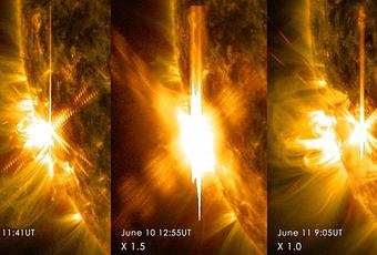 C’est à 11 h 42 TU que le satellite Solar Dymamics Observatory (SDO) a enregistré la première éruption. Notée X2.2 par les physiciens solaires, elle fut beaucoup plus violente que le deuxième coup de semonce, de classe X1.5, observé au même endroit à 12 h 52 TU. S’ensuivit dans la foulée une remarquable éjection de masse coronale (à voir ici). La charge de plasma expulsée dans l’espace n’a pas échappé à Stereo A. Doté d’un coronographe, le satellite a pu suivre son déploiement. Dans un premier temps, les modélisations numériques du NOAA ont exclu une déferlante en direction de la Terre. Toutefois, après révision, il est probable qu’une partie du nuage de particules heurte notre magnétosphère le 13 juin. Ce qui occasionnera un probable nouvel épisode auroral dans les contrées proche des pôles. Le 11 juin, une nouvelle éruption a frappée. Classée X1, elle s’est manifestée dans la même région du Soleil à 09h05 TU.