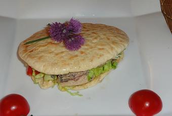 Ingrédients : 2 pains pita - quelques feuilles de laitue - 4 tomates cerises - une boite de sardines préparées à l'ancienne - ciboulettes