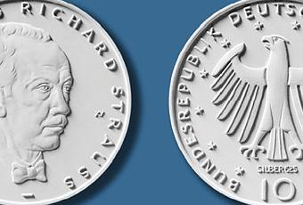Suite à une décision du gouvernement fédéral allemand, une pièce commémorative a été frappée à l'occasion du 150èeme anniversaire de la naissance de Richard Strauss (1864-1949), compositeur allemand né le 11 juin 1864 à Munich..