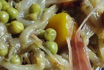 Poêlée d'endives aux petits pois, à la courge et aux condiments italiens (et plus): 6 belles endives 1 petite tasse de petits pois 1 beau morceau de courge butternut quelques tranches de jambons de pays 6 ou 7 filets d'anchois à l'huile 1 cuillerée à soupe de câpres 1 belle cuillerée à soupe de baies de goji 1 peu de beurre
