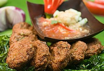 500g de filets de poisson haché - 250g de haricots verts finement ciselés -1 œuf battu -1/4 de tasse d’échalotes coupées - 1/4 de tasse d’ail haché -1/4 de tasse de citronnelle hachée - 1/2 cuillère à soupe de coriandre hachée - 1/2 cuillère à soupe de galanga haché -1/2 cuillère à café de poivre - 1/2 cuillère à café de zeste de bergamote - 1 cuillère à café de pâte de crevettes - 5 à 10 piments secs sans graines, broyés - 1/2 cuillère à soupe de sel - 1 tasse d’huile végétale.