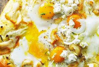 J'ai le Jiminy Cricket un peu insistant faut dire. Et le temps que cette proposition arrive à mon cerveau embrumé du matin, je me suis dit ça s'tente !Et voilà comment après avoir passé la tête dans le frigo pendant un bon moment à la recherche de quoi y mettre dessus, je suis ressorti un peu verglacé du bec mais avec une p'tit idée qui a bien plu chez moi !Pizza petit déjeuner au menu !Ingrédients : 1 pâte à pizza ou 400g de pâte à pain – 1 jaune d'œuf - 2 boule de mozzarella – 120g de haddock coupé en très fines tranches (vous pouvez le remplacez par du saumon fumé) – 2 oignons nouveaux – 4 œufs - 60g de feta coupée en petits cubes – huile d'olive - poivre Commencez par bien égoutter la mozzarella sinon elle risque de détremper votre pizza, coupez-la en tranches et égouttez-la. Puis séchez la mozzarella, enveloppez-la dans du papier absorbant et laissez-la sous une planche avec un poids posé dessus jusqu'à ce que le papier absorbant soit complètement détrempé.Coupez l'oignon en très fines tranches.Déposez votre pâte sur une plaque couverte de papier sulfurisé. Badigeonnez le tour de la pizza au pinceau avec le jaune d'œuf coupé d'un peu d'eau.Commencez par déposer sur la pâte la mozzarella grossièrement déchirée. Ajoutez les deux tiers des oignons rapidement chiffonnés et le haddock lui aussi chiffonné.Préparez 4 niches où vous mettez les œufs, ne vous inquiétez pas les niches vont sans doute pratiquement se refermer, mais c'est mieux que rien.Enfournez dans un four préchauffé à 210° pendant 10 minutes.Ressortez alors la pizza et ajoutez les œufs, cassez-les d'avance séparément dans des petits bols pour aller plus vite. Pensez à refaire les niches avant de mettre les œufs sinon ils vont glisser sur la pizza et vous risquez de les cuire sur la grille !Baissez le four à 180° et enfournez pendant 2 minutes, retournez alors la pizza et remettez au four jusqu'à ce que les œufs soient à point, comptez 2 minutes de plus.Dès qu'elle est prête servez-la après avoir parsemé dessus les oignons restants et la feta, terminez en arrosant d'un filet d'huile d'olive et en parsemant de poivre.