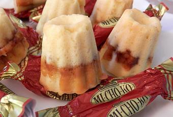 Tasser un peu de pâte dans le fond des empreintes à mini-cannelés. Déposer un Mi-cho-ko dessus puis recouvrir d'un peu de pâte par-dessus en tassant un peu.