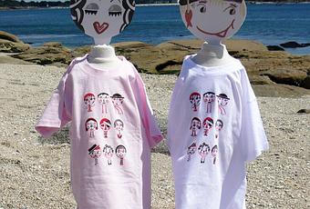 un "shooting" à la plage de Concarneau cet après-midi pour les mannequins des Quat'Sardines qui ont enfilé les tout nouveaux maillots de corps pour parler vintage... il s'agit bien de T-Shirts, sérigraphiés à Saint-Malo. Le printemps a été studieux avant de rendre les copies à Bretano la boutique de Pont-Croix; l'équipe déjà fan des cartes découpées signées Anh Gloux a très vite imaginé les dessins reproduits sur textile. Une sélection de personnages espiègles: Pirate pour Rire, Miss Crevette, King Fish, frimousses de petits bretons et lutins marins lancent la collection enfants.