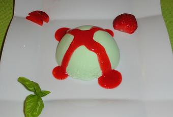 Ingrédients : 100g de fraises - 20cl de crème liquide - 15cl de lait - 40g de sucre - 2 feuilles de gélatine - 2 c à s de sirop de basilic