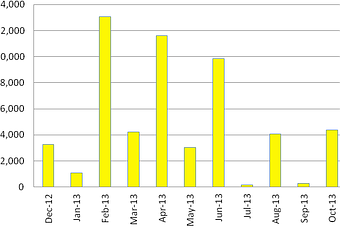 On peut remarquer que le modèle continue de se répéter : un mois de livraisons importantes est toujours suivi d'un mois de très faibles livraisons, pour atteindre un niveau symbolique de 39 contrats en novembre, soit 121,3 Kilogrammes !