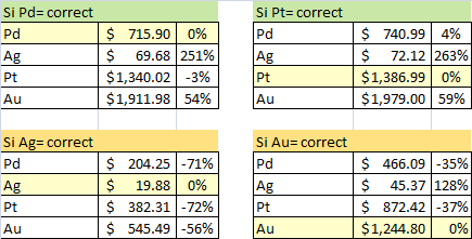 Les tableaux ci-dessous donnent le des quatre métaux en supposant à chaque fois qu’un de ceux-ci est correctement évalué et que les autres devraient êtres évalués de la même façon en se basant sur l’occurrence relative du métal de référence. La troisième colonne donne l’écart par rapport au prix actuel de chaque métal :