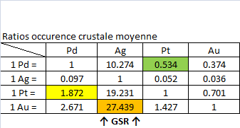 En Anglais et en Français.J’ai repris ci-dessous les donnée qui nous intéressent. J’y ai inclus les cours du jour pour mes calculs plus bas, que j’ai pris sur xe.com.Je ne suis pas assez expert en la matière pour déterminer laquelle des méthodes de calcul d’abondance est la plus appropriée pour mes calculs, j’ai donc tout simplement pris la moyenne des trois pour calculer les ratios.Abondance Crustale des Métaux Précieux :
