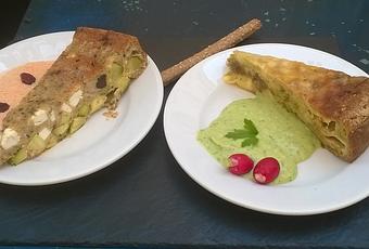 - l'appareil est constitué des ingrédients suivants : oeufs battus, farine T110, levure maltée, lait d'amande, huile d'olive, noix de muscade râpée, fenugrec en poudre, huile d'olive, persil frais ciselé, sel gris, poivre du moulin