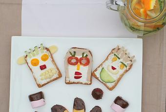 Pour le salé, j’ai utilisé des biscottes, tartinées avec du fromage frais type Philadelphia, puis je me suis amusée à créer des personnages. Laissez aller votre imagination, imaginez que vous croquez votre amoureux avec tendresse ou alors votre pire ennemie !!!! Jambon, mais, concombre, tomates cerises … il n’y a que des bonnes choses sur ma copine Drôle de Tartine !