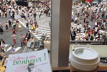 Photo juin 2014 – Claire cultive son bonheur au Starbuck du carrefour de… Shibuya à Tokio !