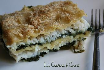 4. Beurrer un plat à gratin puis intercaler feuilles de lasgnes, béchamel, épinards et sabre en plusieurs couches successives.