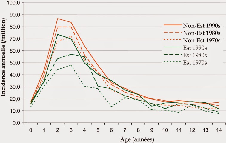 Distribution de l'incidence des leucémies avec l'âge en Europe: évolution par période (années 1970s, 1980s, 1990s) dans les pays de l'est de l'Europe (Estonie, Bélarus, Slovaquie, Hongrie, Slovénie, Turquie) et dans les autres pays couverts par le systèpme ACCIS (Islande, Norvège, Danemark, Finlande, Grande Bretagne, Irlande, Allemagne, France, Suisse, Espagne, Italie, Malte) (d'après ACCIS, Steliarova-Foucher et coll., 2004)