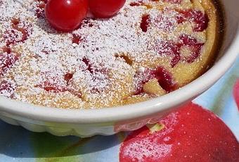 - Disposer les cerises dans le plat, puis verser la préparation par - dessus. Enfourner 35 à 40 minutes. Laisser tiédir et poudrer de sucre glace. Servir froid dans le moule.