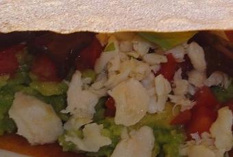 Déposez de la purée d'avocat sur un double triangle de brick. Garnissez de crabe, de dés de tomate et de feuilles de salade.