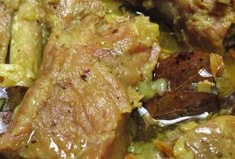 Spare ribs in spicy broth Ingredients 1 kg spare ribs, cut into slices 1 large onion, chopped 1 cm ginger, chopped 2 cloves garlic, chopped 3 cinnamon leaves (tejpatta) or bay leaves, if not available 3 green chillis, pierced 1 cm fresh turmeric root, chopped, or 1 tsp turmeric Salt Method Put all the ingredients with 400ml of water in a pressure cooker. From the pressurization, cook 7 minutes. If you do not have a pressure cooker, bring to a boil and them simmer for about an hour. That's all, it's ready to serve.