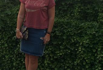 Shoes / Sam Edelman, Jupe / Sandro, pochette & tee-shirt / Primark