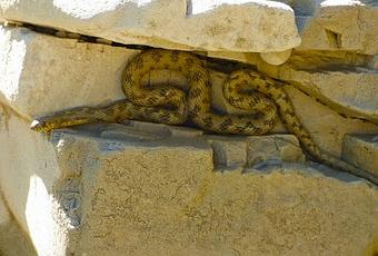 Alors que nous étions immergés dans l'une des vasques/jacuzzi de la rivière, occupés à nous faire masser par des petites cascades, (le rêve ! Je sais...je sais...), nous avons ressenti une présence à coté de nous. En y regardant de plus près, nous avons vu que nous avions un superbe serpent comme voisin (moins le rêve ! je sais...je sais...). En fait, ils étaient deux au départ à profiter comme nous de la rivière et à prendre le soleil sur l'un des rochers dépolis. Le premier a immédiatement plongé dans la rivière lorsqu'il s'est senti découvert et a disparu dans les flots. Le second n'avait pas vraiment l'intention de perdre sa place et avait l'air de se moquer parfaitement de partager le lieu avec nous. Il a donc continué à se chauffer au soleil alors que prudemment nous nous éloignions un peu...Les serpents ont cette faculté naturelle de faire fuir automatiquement les humains même s'il sont inoffensifs. C'est d'ailleurs le cas de cette couleuvre qui cependant peut être confondue avec la vipère, d'où son nom.Nous en avons néanmoins profité pour l'observer... La belle n'a pas bougé d'un pouce. C'est vrai qu'elle avait l'air d'être plutôt bien installée...