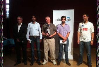 La photo du podium du Master de Montpellier 2013 avec le grand-maître Glenn Flear 1er, et les maîtres internationaux Philippe Brochet 2e et M.S. Thejkumar 3e, tous à 7 points sur 9. Ils sont entourés par Hervé Louche et Olivier Lafarge du club d'échecs de Montpellier - Photo © Chess & Strategy