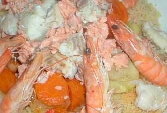 300g de couscous fin 2 filets de poisson blanc à chair ferme 2 filets de saumon 1 boite de 425g net de tomates pelées 200g de carottes 100g de navets 200g de courgette 1 blanc de poireau 200g de pois chiches en conserve raisins secs blonds 1 oignon 4 gousses d'ail Laurier Thym 1 c. à café d'épice à couscous ( Ras el anout) Harissa 70g d'huile d'olive Sel, poivre