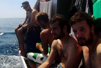 Première (petite) déception. Pour d’obscures raisons, nous ne faisons pas le stop prévu à Gili Bola pour observer les chauves-souris qui peuplent l’île et admirer le coucher de soleil. Nous avons donc droit à un premier segment très long jusque Moyo Island, que nous atteindrons seulement le lendemain matin vers 6h. On boit donc des bières pendant ce temps. L’escale à Moyo Island nous permet de prendre l’unique « douche » dans la cascade. La seule du trip. Elle s’avère d’ailleurs très utile : nous devons ensuite regagner le bateau à la nage. Ca reste l’occasion de faire les cacous à grimper en haut de la cascade et sauter du haut d’un arbre dans une petite piscine naturelle de 4 mètres carrés. Sony, notre super capitaine, décerne le titre du plus gros cacous à Mael.