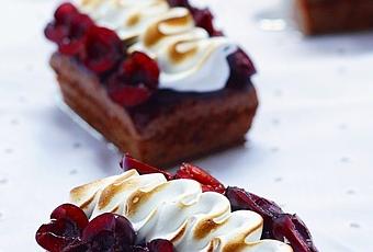 - Dresser la meringue à l'aide d'une poche à douille, puis disposer les demi-cerises.