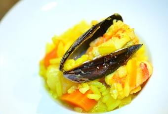 Verser l’eau, puis disposer dessus les morceaux de poissons coupés en gros cubes et les moules.