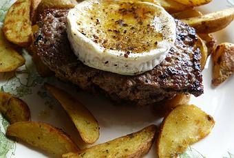 Poser sur chaque steak un cabecou assez tendre, donner un tour de moulin à poivre. Laisser couler un très fin filet de miel liquide ...