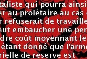 Le chômage massif constitue l’armée industrielle de réserve, plus son nombre est élevé, mieux ce sera pour le capitaliste qui pourra ainsi affirmer au prolétaire au cas où ce dernier refuserait de travailler, qu’il peut embaucher une personne à moindre coût moyennant le même travail étant donné que l’armée industrielle de réserve est importante.Karl Marx
