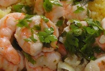 Servez les crevettes chaudes arrosées de vinaigrette au persil et accompagnées d'une semoule de couscous.