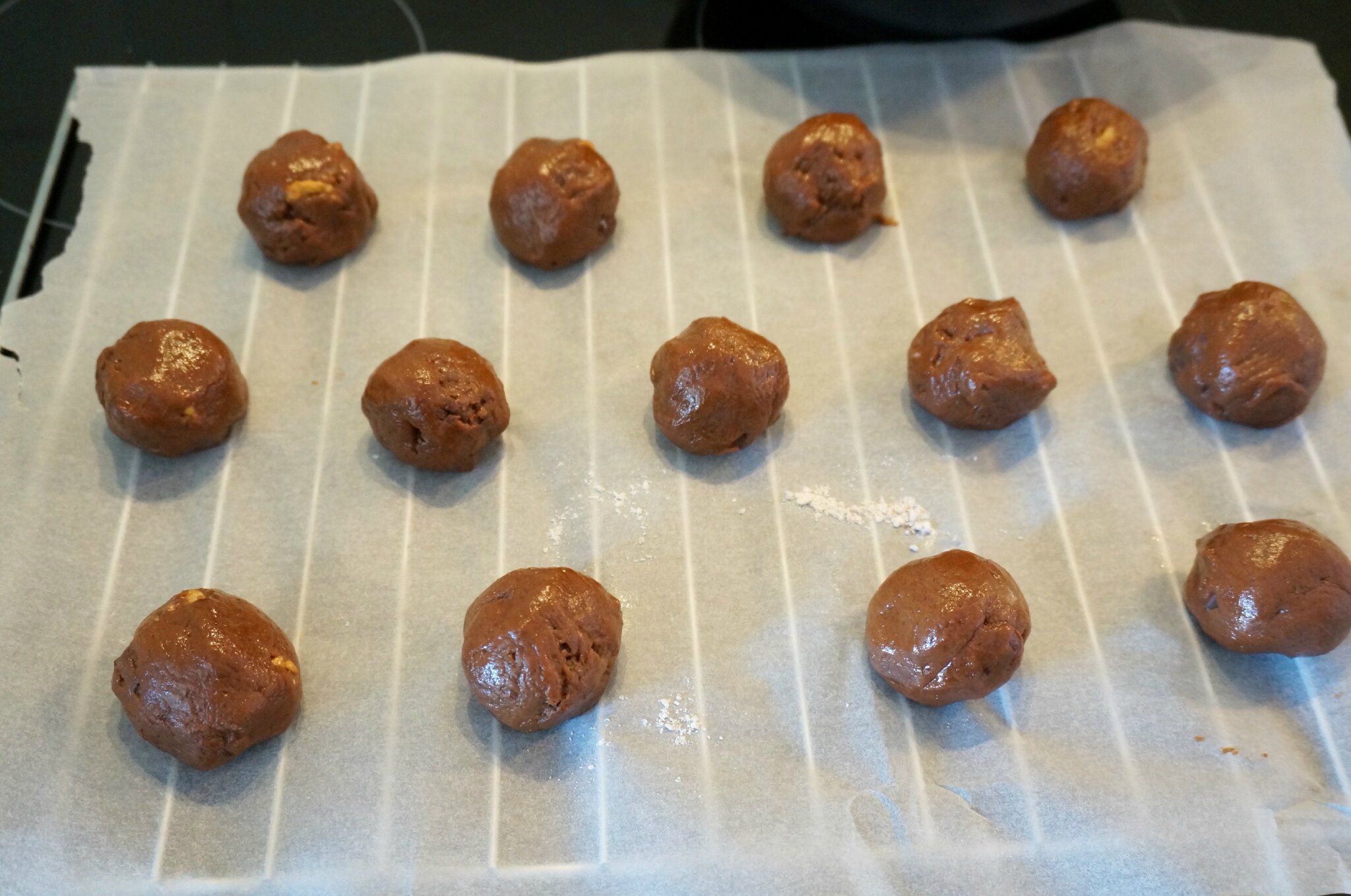 Enfournez dans un four préchauffé à 160°C pendant 20-25 minutes. Les cookies sont encore crus à l'intérieur quand on les sort mais c'est normal : ils continuent de "cuire" un peu et durçissent en refroidissant.