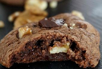 Ajoutez, petit à petit, ce mélange à la pâte chocolatée. Mélangez rapidement le tout, sans trop insister puis ajoutez les pépites de chocolat et les noix (gardez-en un peu pour décorer les cookies avant d'enfourner).