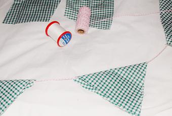 Passez la corde entre les deux replis. Sois vous collez avec de la colle à tissus. A défaut, un point de couture et le tour est joué. Ajoutez une petite déco supplémentaire si vous avez le temps et vous pouvez accrocher votre fanion.