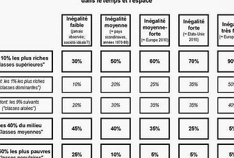 « Pour donner un premier ordre de grandeur, la part des 10 % des personnes recevant le revenu du travail le plus élevé est généralement de l’ordre de 25 %-30 % du total des revenus du travail, alors que la part des 10 % des personnes détenant le patrimoine le plus élevé est toujours supérieure à 50 % du total des patrimoines, et monte parfois jusqu’à 90 % dans certaines sociétés.De façon peut-être plus parlante encore, les 50 % des personnes les moins bien payées reçoivent toujours une part non négligeable du total des revenus du travail (généralement entre un quart et un tiers, approximativement autant que les 10 % les mieux payés), alors que les 50 % des personnes les plus pauvres en patrimoine ne possèdent jamais rien – ou presque rien (toujours moins de 10 % du patrimoine total, et généralement moins de 5 %, soit dix fois moins que les 10 % les plus fortunés). »Ainsi la moitié inférieure de la société ne posséderait que sa force de travail, et n’aurait accumulé aucun capital.Une autre différence importante, cette fois à l’intérieur du capital, est la différence de sa composition en fonction de sa taille. Aujourd’hui, dans nos sociétés développées, le patrimoine net moyen est d’environ 200 000 € par adulte, et il est composé pour 2/3 par de l’immobilier, et 1/3 par des actifs financiers et professionnels.Que devient cette répartition si on analyse par niveau de richesse ?Les plus pauvres qui représentent 50% de la population ne détiennent que 5% du capital total, et pour eux le patrimoine moyen par adulte n’est que 20 000 €. Le plus souvent, ce sont des locataires, et leur patrimoine est composé de biens durables comme du mobilier ou une automobile. La part supérieure peut être propriétaire de son appartement, mais il est grevé des emprunts restant à rembourser, d’où un actif net modeste.Les 40% suivants qui détiennent 35% du capital total, ont un actif moyen de 175 000 €. C’est au sein de cette tranche qu’apparaissent les premiers réels actifs financiers et économiques : quand le patrimoine dépasse les 300 000 €, l’immobilier représente encore l’essentiel, mais le patrimoine financier devient significatif, surtout quand les emprunts ont fini d’être remboursés.Venons en maintenant aux 10% les plus favorisés. Leur patrimoine moyen est de 1,2 M€. Zoomons au sein de cette tranche.Les premiers 9% ont un patrimoine de 900 000 €, versus 5M€ pour le 1% du haut. Ils sont tous propriétaires de leur appartement. Mais alors que les actifs immobiliers représentent de la moitié aux trois-quarts du patrimoine des premiers 9%, pour le décile supérieur, ce sont les actifs financiers et professionnels qui dominent : « Entre 2 et 5 millions d’euros, la part de l’immobilier est inférieure à un tiers ; au-delà de 5 millions d’euros, elle tombe au-dessous de 20 % ; au-delà de 20 millions d’euros, elle est inférieure à 10 %, et les actions et parts constituent la quasi-totalité du patrimoine. »(à suivre)
