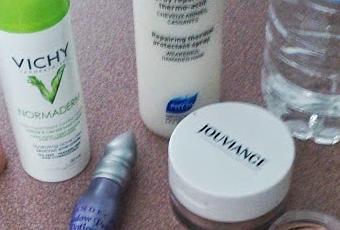 Côté visage, pas le temps de niaiser avec un lourd maquillage, je mélange plutôt une crème teintée à ma crème hydratante Normaderm de Vichy. Donc j'ai le côté matifiant et teinté en combattant l'apparition des boutons et comédons dû à la chaleur! Ensuite j'applique la poudre tellement rafraîchissante de Jouviance qui va empêcher mon surplus de sébum d'apparaître et de me rafraîchir en même temps...