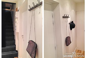 Mylène : Avec plaisir ! Voici l’entrée (petite mais pratique !).Elle dessert la salle d’eau (petite également mais optimisée) et un placard buanderie. Je l’ai décoré de manière minimaliste car elle est étroite. J’ai trouvé ces patères d’écolier (créées par Marie de « chez les voisins ») lors d’une vente éphémère par A3 sérial chineuses.